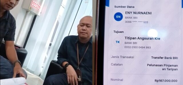 Foto : petugas BRI yang sempat Bisitegang kepada, Ketua LPKSM Krisna Cakra Nusantara, Sugiyono SH, dan jurnalis yang hendak meliput namun dilarang. Serta bukti pembayaran penadah alias cukong yang membawa sertifikat tersebut.