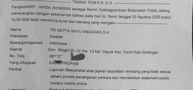 REMBANG | PortalIndonesiaNews.Net – Dunia penegakan hukum di Kabupaten Rembang kembali tercoreng. Seorang perwira polisi yang menjabat sebagai Kanit Reskrim Unit III Satreskrim Polres Rembang dilaporkan ke Bidpropam Polda Jawa Tengah atas dugaan memberikan klarifikasi menyesatkan yang mencemari proses penyidikan dan merugikan pihak terlapor.